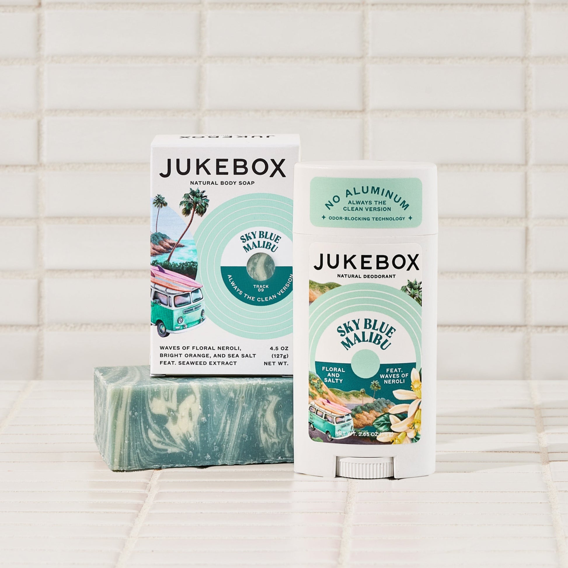 One natural cold process soap and one natural deodorant, all in our seaside Sky Blue Malibu scent.